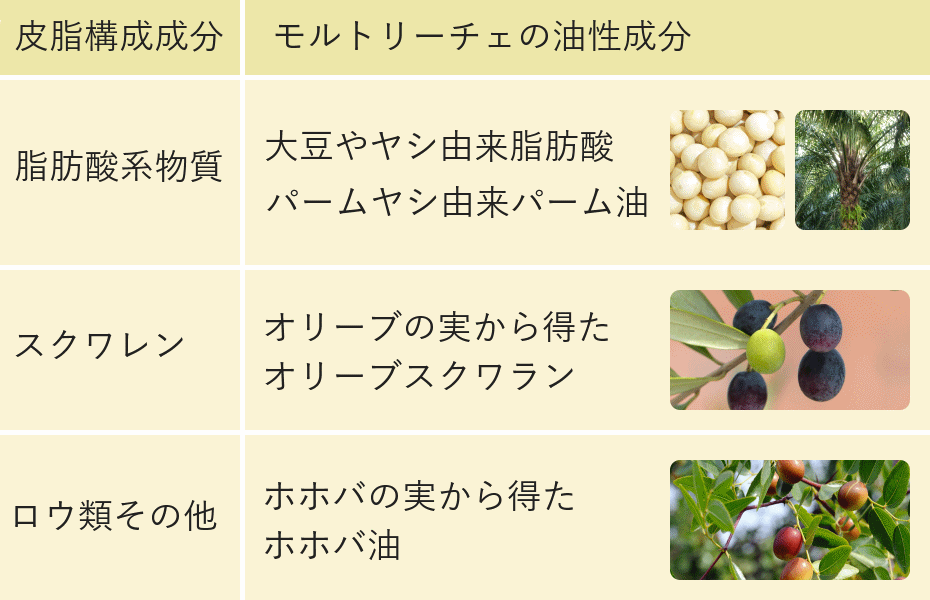 | モルトリーチェ化粧品のベース成分は、皮脂の構成成分を基につくられてい